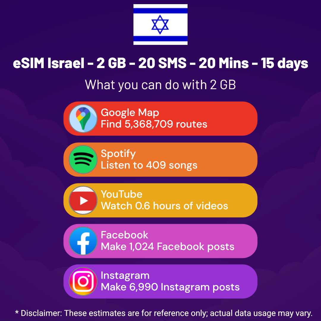 Hello, Globetrotter! 🚀 Gearing up for a journey to the world’s hidden gem, Israel? Let our 2 GB – 20 SMS – 20 Mins – 15 days eSIM be your reliable digital ally, ensuring you remain connected at every step!