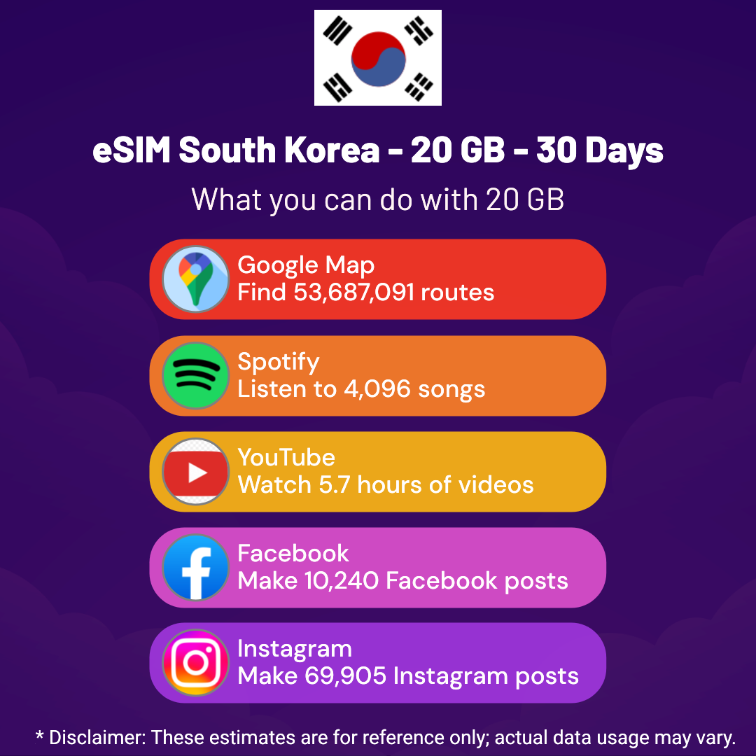 ✔️ Redes: Nuestra eSIM de Corea del Sur se sincroniza con los proveedores de red locales, lo que garantiza una cobertura ininterrumpida.