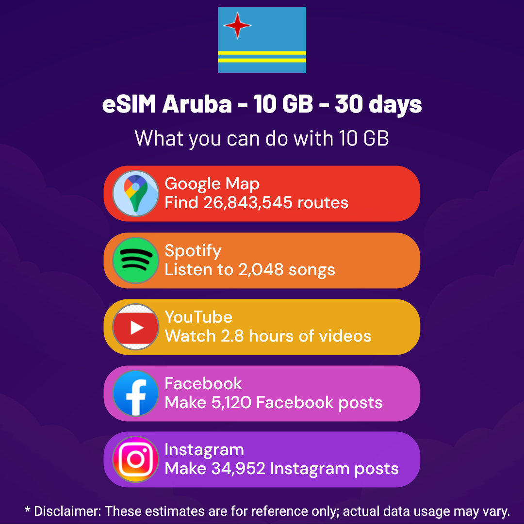 Hello, Globetrotter! 🚀 Gearing up for a journey to the world’s hidden gem, Aruba? Let our 10 GB – 30 days eSIM be your reliable digital ally, ensuring you remain connected at every step!