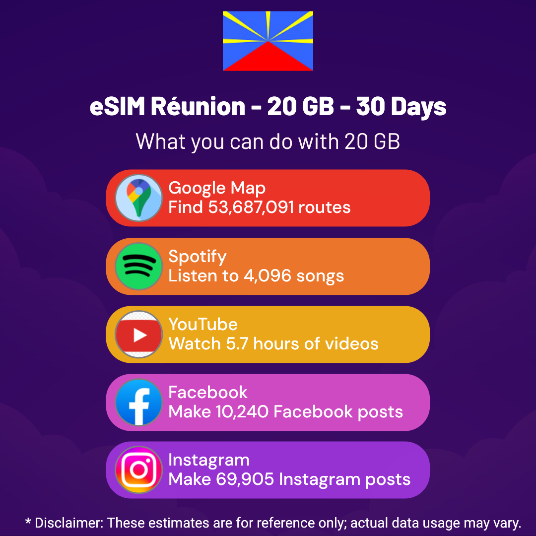 Hello, Globetrotter! 🚀 Gearing up for a journey to the world’s hidden gem, Réunion? Let our 20 GB – 30 Days eSIM be your reliable digital ally, ensuring you remain connected at every step!