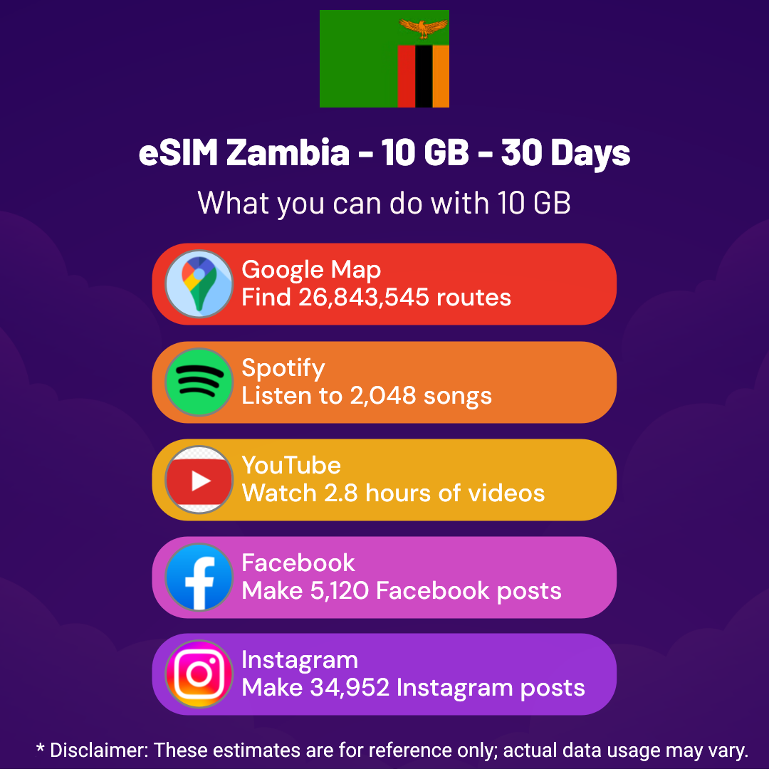 Hello, Globetrotter! 🚀 Gearing up for a journey to the world’s hidden gem, Zambia? Let our 10 GB – 30 Days eSIM be your reliable digital ally, ensuring you remain connected at every step!
