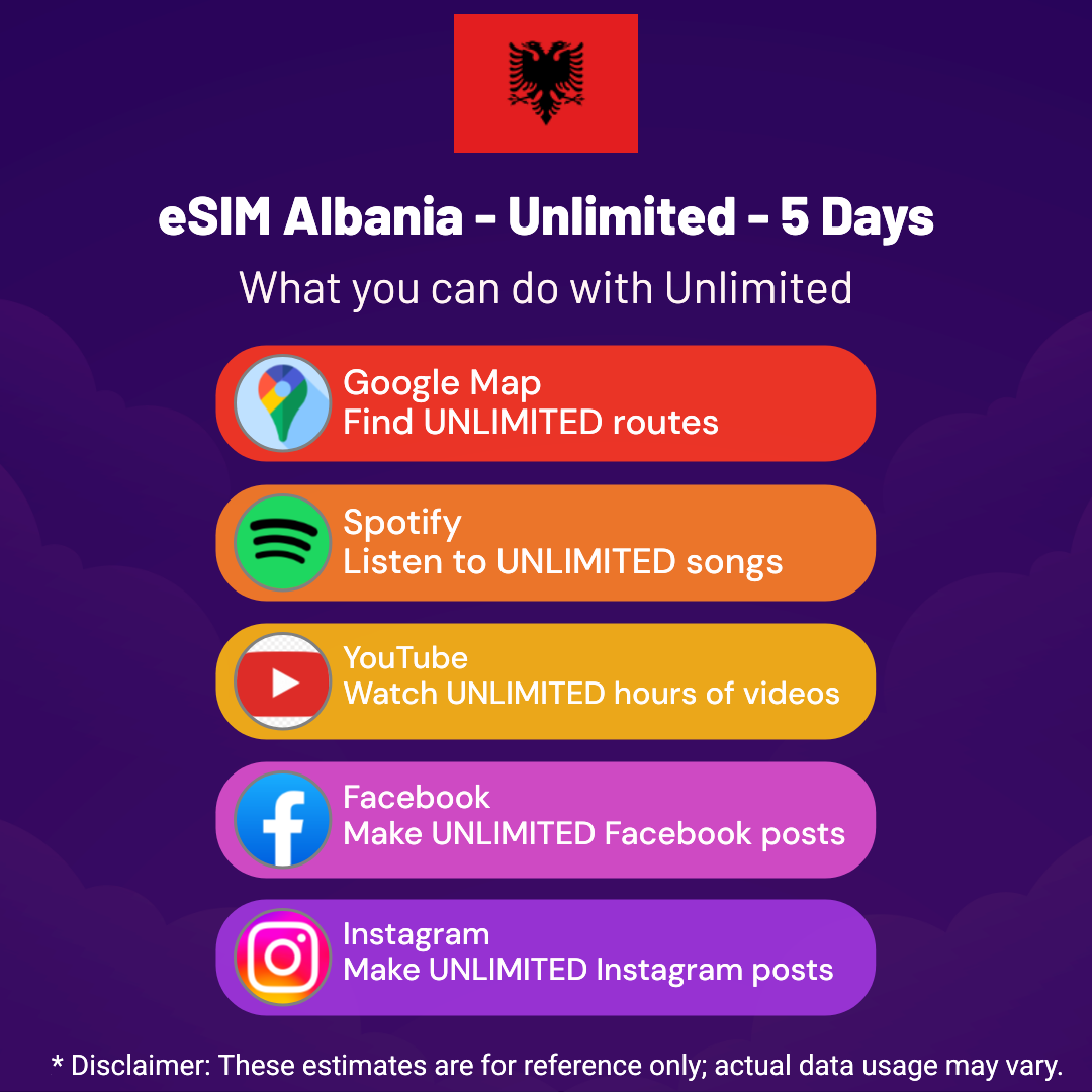 Hello, Globetrotter! ๐ Gearing up for a journey to the world’s hidden gem, Albania? Let our Unlimited – 5 Days eSIM be your reliable digital ally, ensuring you remain connected at every step!