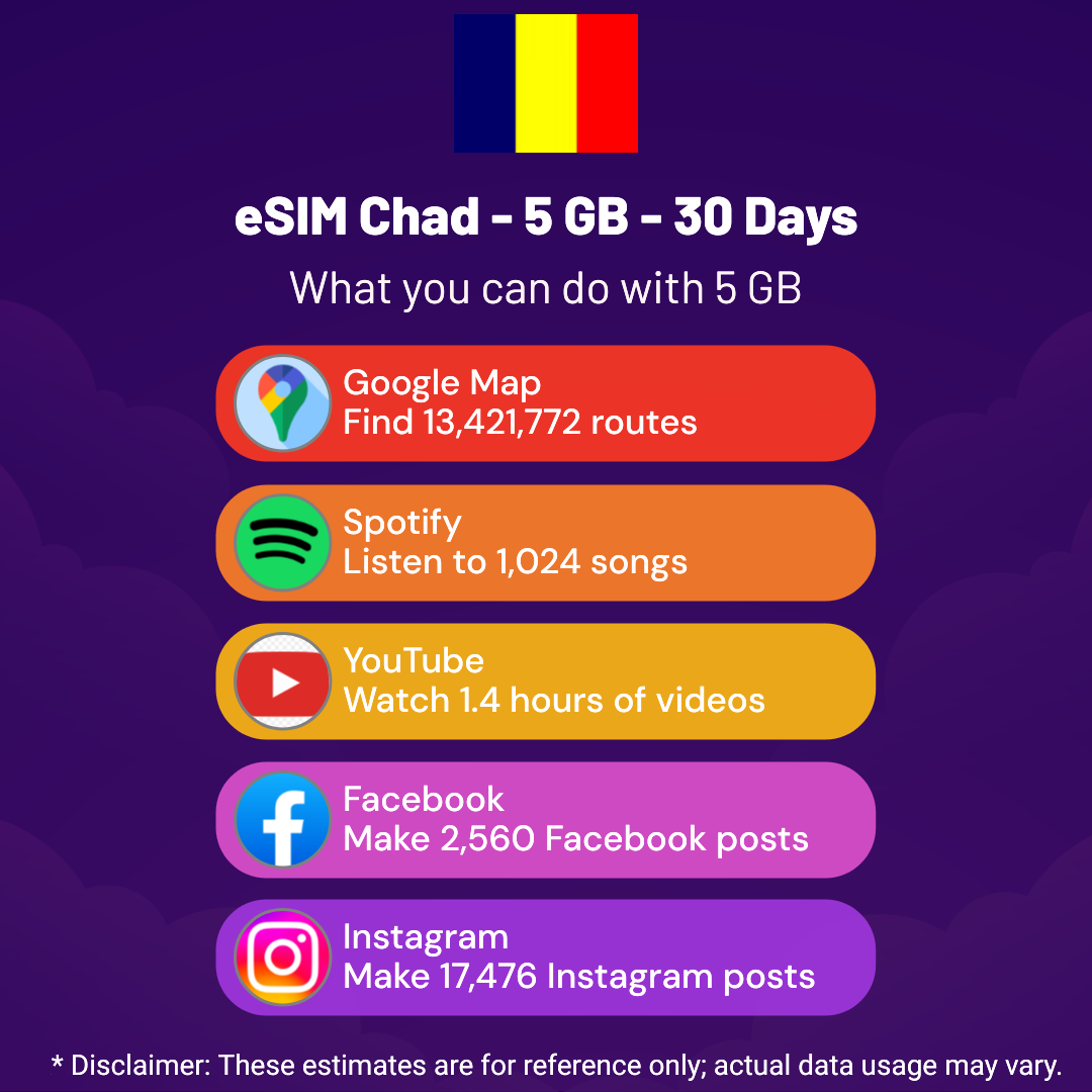 Hello, Globetrotter! ๐ Gearing up for a journey to the world’s hidden gem, Chad? Let our 5 GB – 30 Days eSIM be your reliable digital ally, ensuring you remain connected at every step!