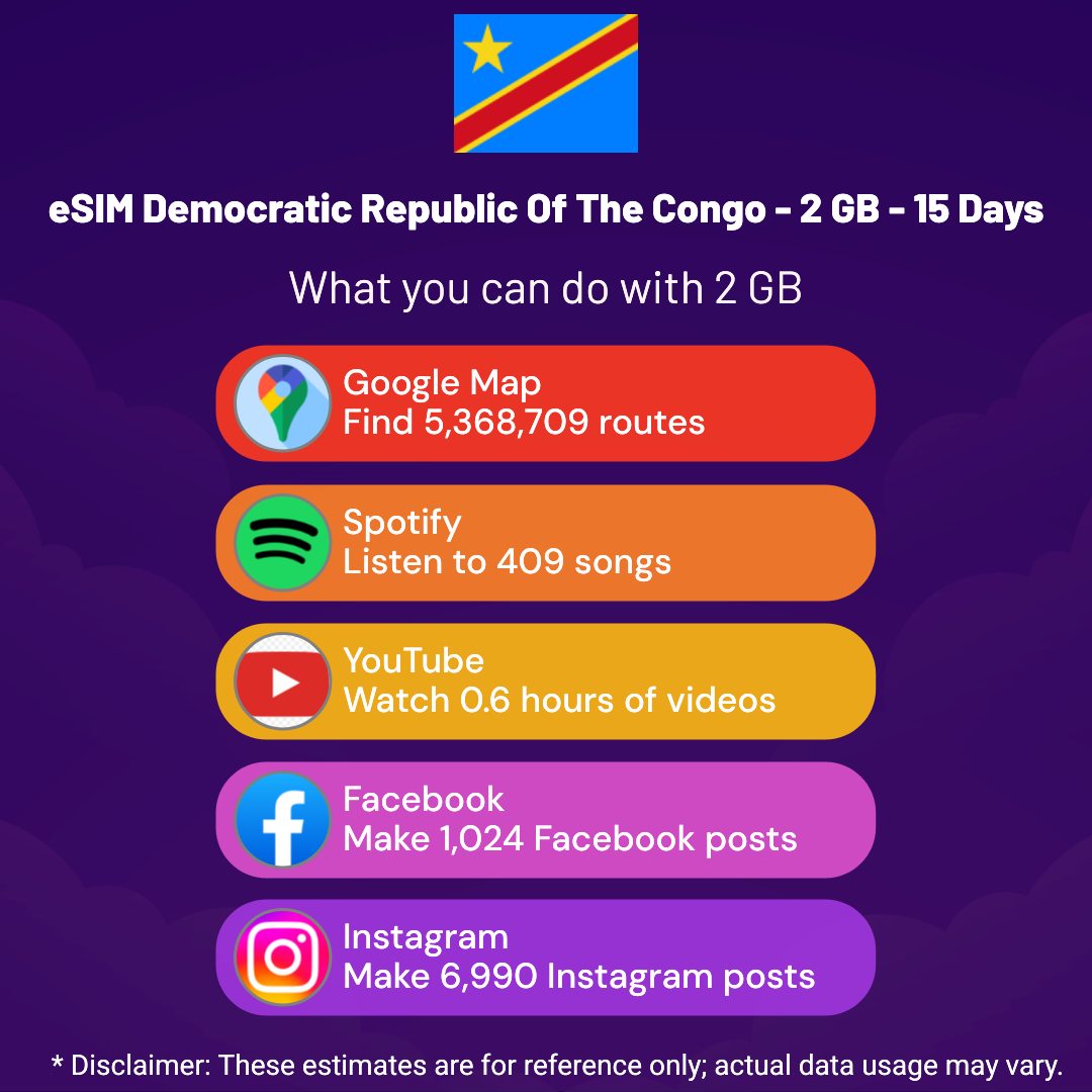 Hello, Globetrotter! ๐ Gearing up for a journey to the world’s hidden gem, Democratic Republic Of The Congo? Let our 2 GB – 15 Days eSIM be your reliable digital ally, ensuring you remain connected at every step!