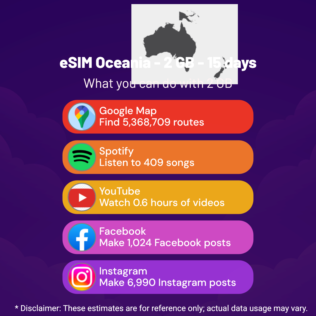 Hello, Globetrotter! ๐ Gearing up for a journey to the world’s hidden gem, Oceania? Let our 2 GB – 15 Days eSIM be your reliable digital ally, ensuring you remain connected at every step!