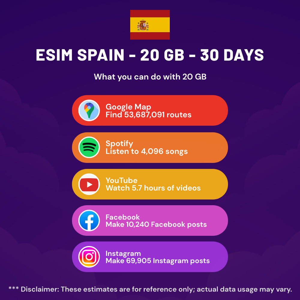 Hello, Globetrotter! ๐ Gearing up for a journey to the world’s hidden gem, Spain? Let our 20 GB – 30 days eSIM be your reliable digital ally, ensuring you remain connected at every step!