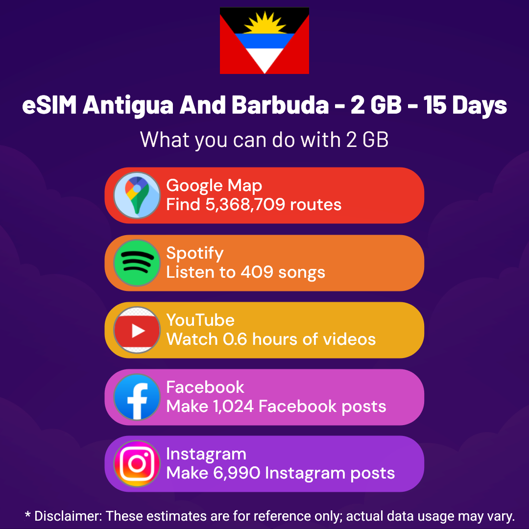 Hello, Globetrotter! 🚀 Gearing up for a journey to the world’s hidden gem, Antigua And Barbuda? Let our 2 GB – 15 Days eSIM be your reliable digital ally, ensuring you remain connected at every step!