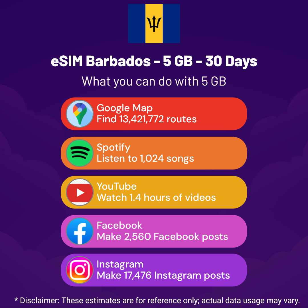 Hello, Globetrotter! 🚀 Gearing up for a journey to the world’s hidden gem, Barbados? Let our 5 GB – 30 Days eSIM be your reliable digital ally, ensuring you remain connected at every step!