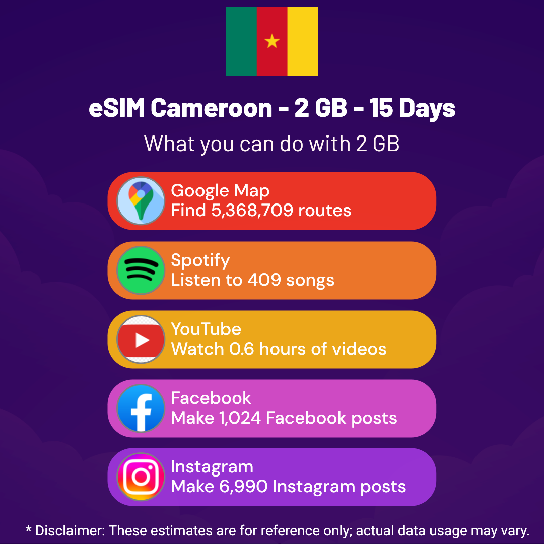 Hello, Globetrotter! 🚀 Gearing up for a journey to the world’s hidden gem, Cameroon? Let our 2 GB – 15 Days eSIM be your reliable digital ally, ensuring you remain connected at every step!