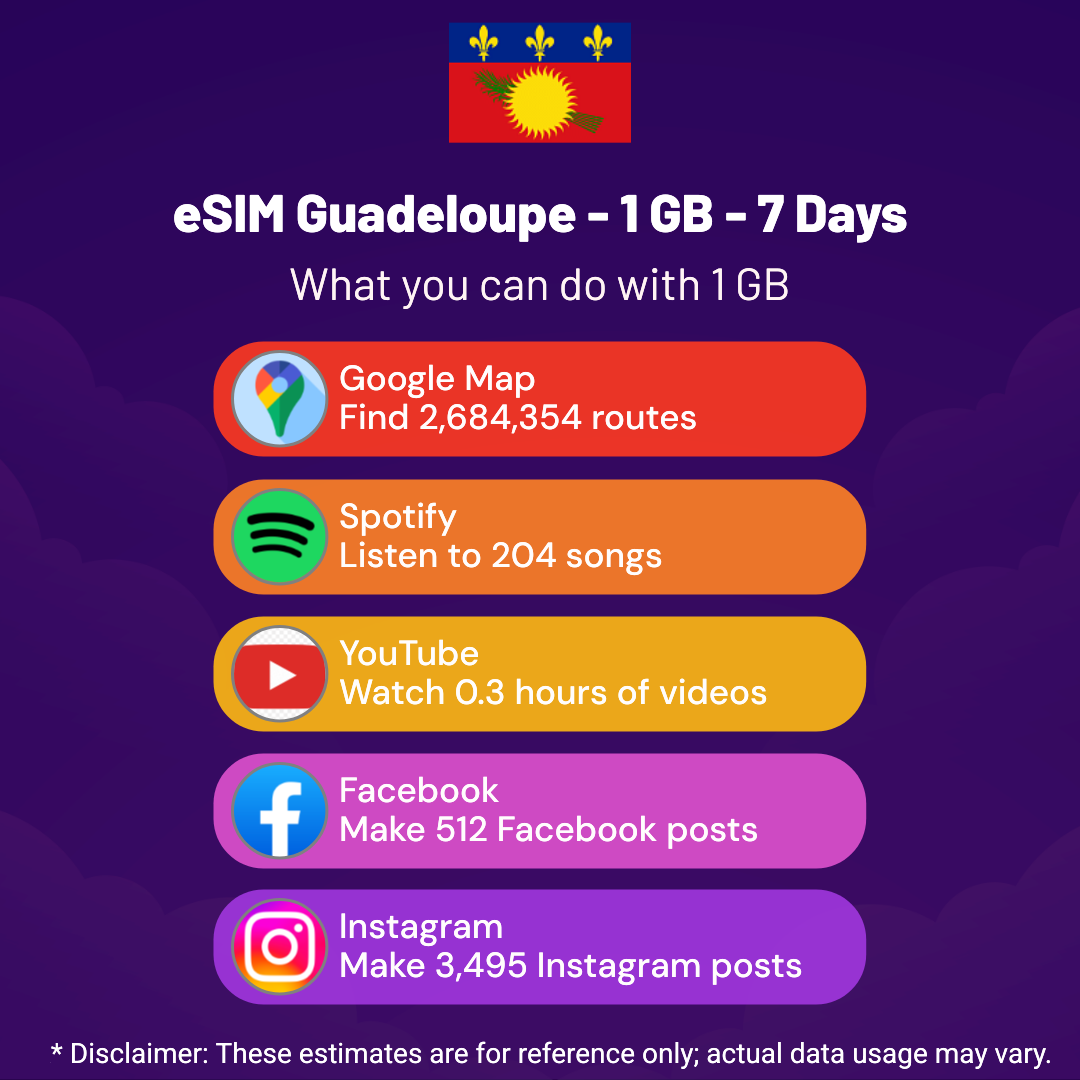 Hello, Globetrotter! 🚀 Gearing up for a journey to the world’s hidden gem, Guadeloupe? Let our 1 GB – 7 Days eSIM be your reliable digital ally, ensuring you remain connected at every step!
