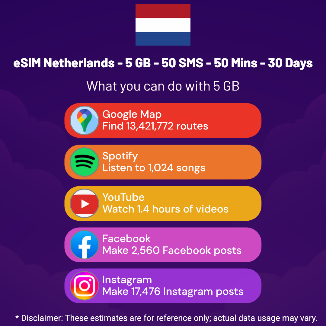 eSIM Netherlands – 5 GB – 50 SMS – 50 Mins – 30 Days