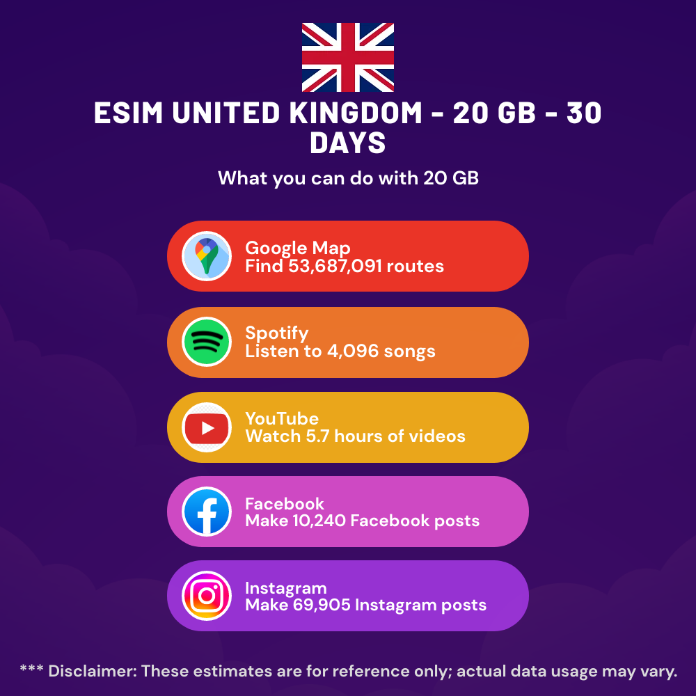 eSIM United Kingdom – 20 GB – 200 SMS – 200 Mins – 30 days