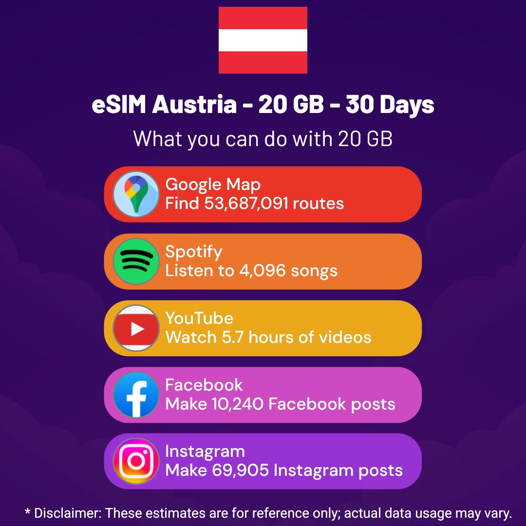 Hello, Globetrotter! 🚀 Gearing up for a journey to the world’s hidden gem, Austria? Let our 20 GB – 30 Days eSIM be your reliable digital ally, ensuring you remain connected at every step!
